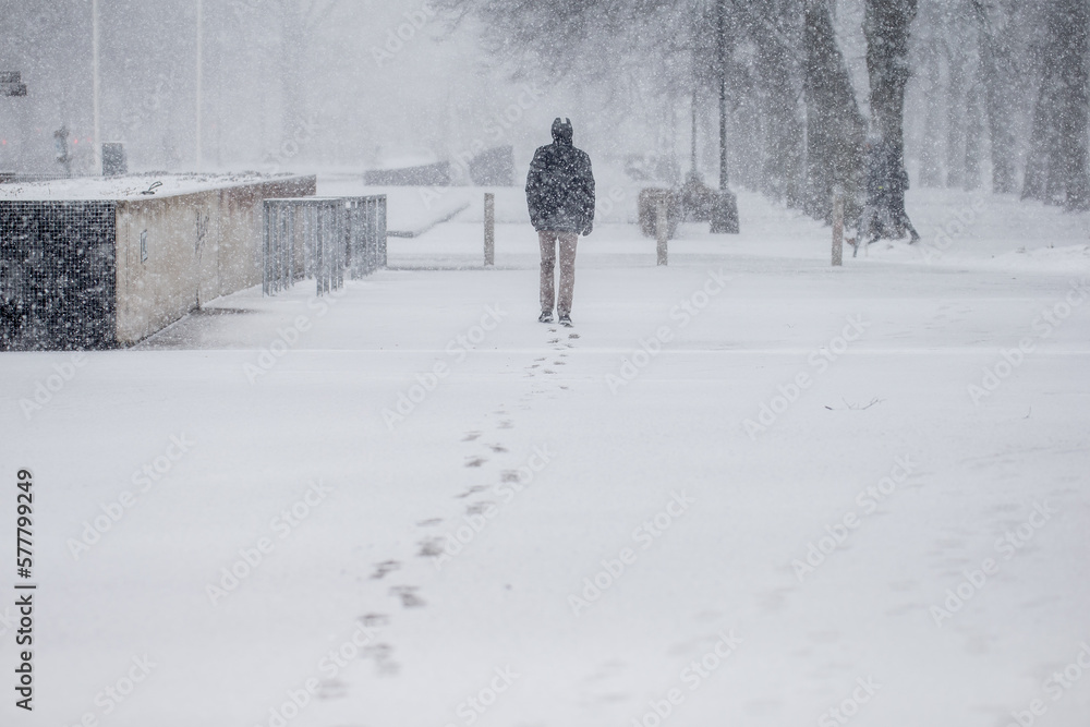 Man leaving a line of footsteps in fresh snow on sidewalk during winterstorm.