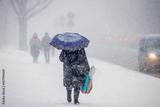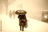 Person walking with groceries bags and umbrella during snow storm in cold weather cities