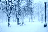 Empty park with trees and benches in heavy snow storm. Everything covered in snow