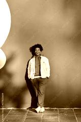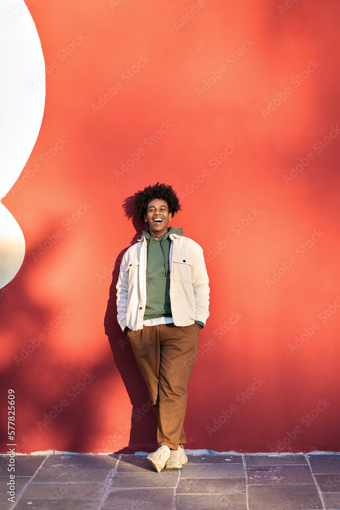 Happy cheerful African American teen guy laughing on red wall lit with sunlight. Smiling cool ethnic gen z teenager model standing looking at camera, authentic full length shot outdoors. Vertical