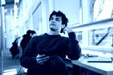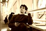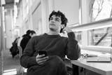 Thoughtful male student holding smartphone, sitting at desk with laptop in a modern library campus