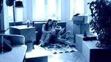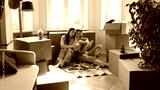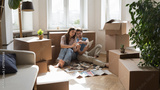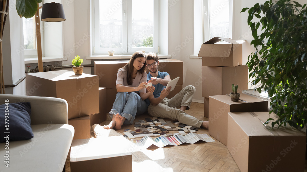 Young married couple of new homeowners selecting finishing interior materials, reviewing tile samples, using online app on tablet, discussing renovation project in new apartment with boxes
