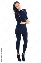 Portrait of a pretty young woman standing with folded hands on white background