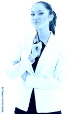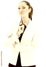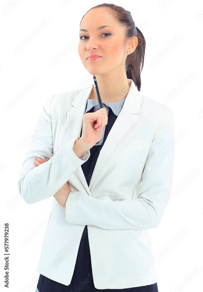 Portrait of a pretty young woman standing with folded hands on white background