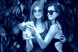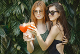 Two girls in swimwear are clinking glasses with cocktails and talking standing near green plant wall