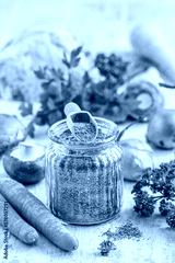Homemade vegetable broth powder, organic vegetable stock, with raw vegetables on white wooden background, vertical