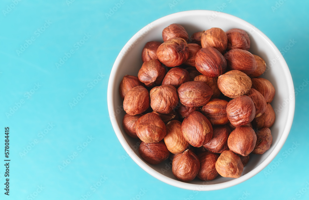 Close up picture of organic hazelnuts in a bowl, selective focus.