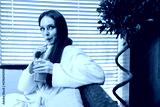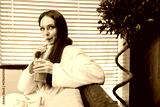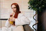 Close-up portrait of pretty young woman in white bathrobe drinking cocktail from straw sitting on sofa by window at spa resort. Charming redhead female relaxing after body treatment at beauty salon.
