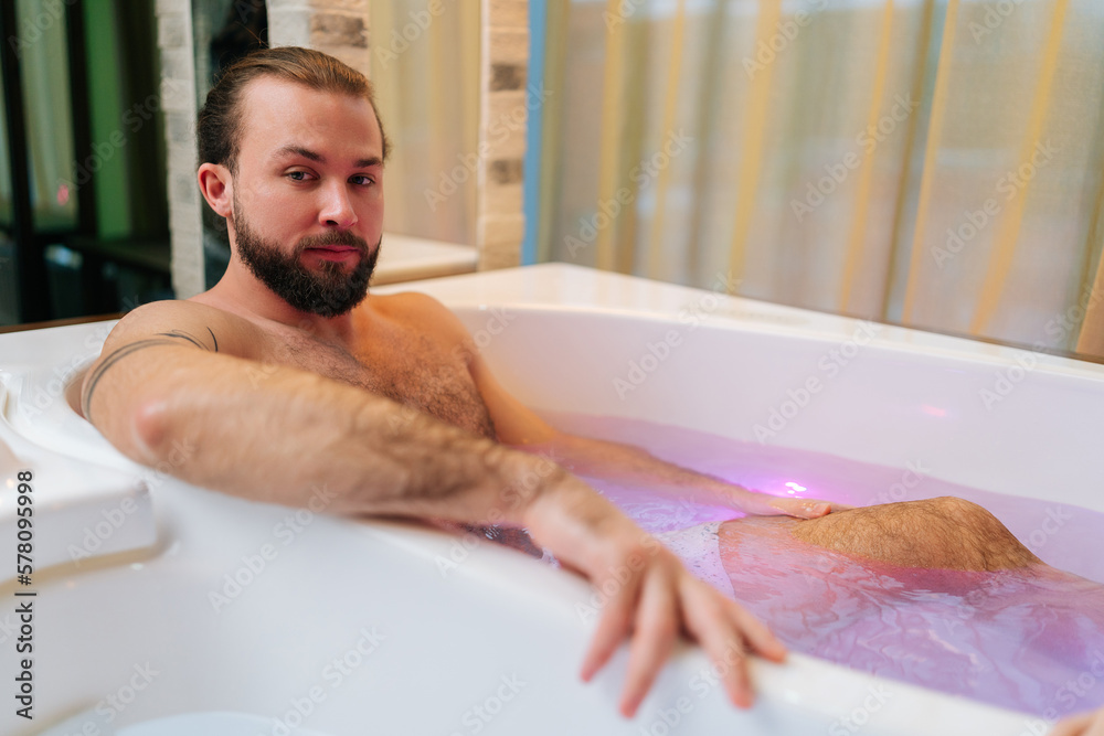 Portrait of handsome young man with beard lying in whirlpool enjoying hydromassage at luxury spa salon. looking at camera. Brutal confident male enjoying procedure of hydromassage.