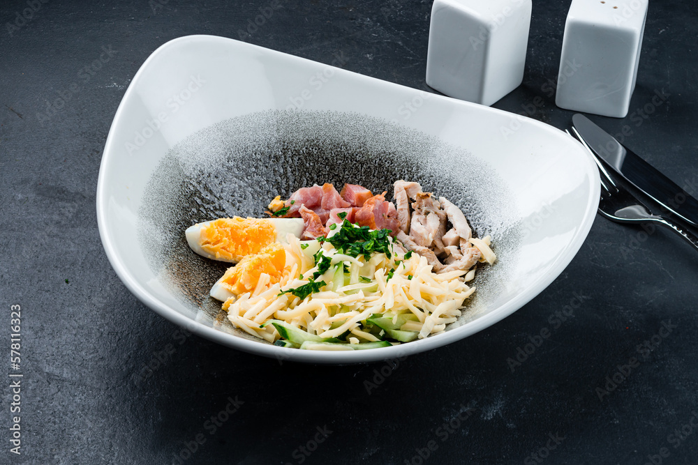 Breakfast boiled egg with ham, cucumbers, cheese and herbs.