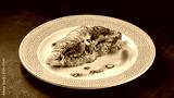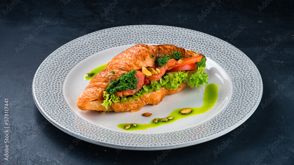 Fresh croissant with salmon, tomatoes, lettuce and pesto sauce.