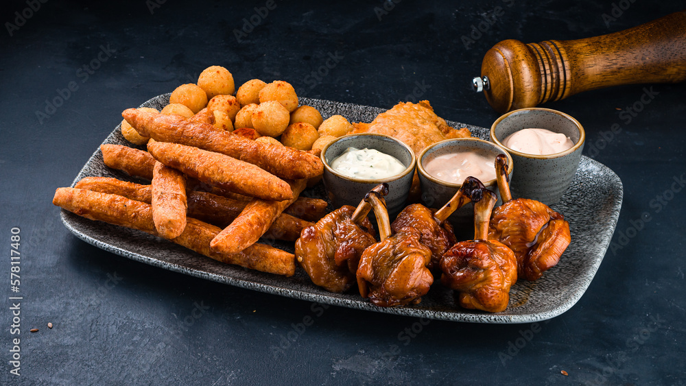 Bar snacks duck legs, cheese balls, chicken fillet, bread sticks and sauces.