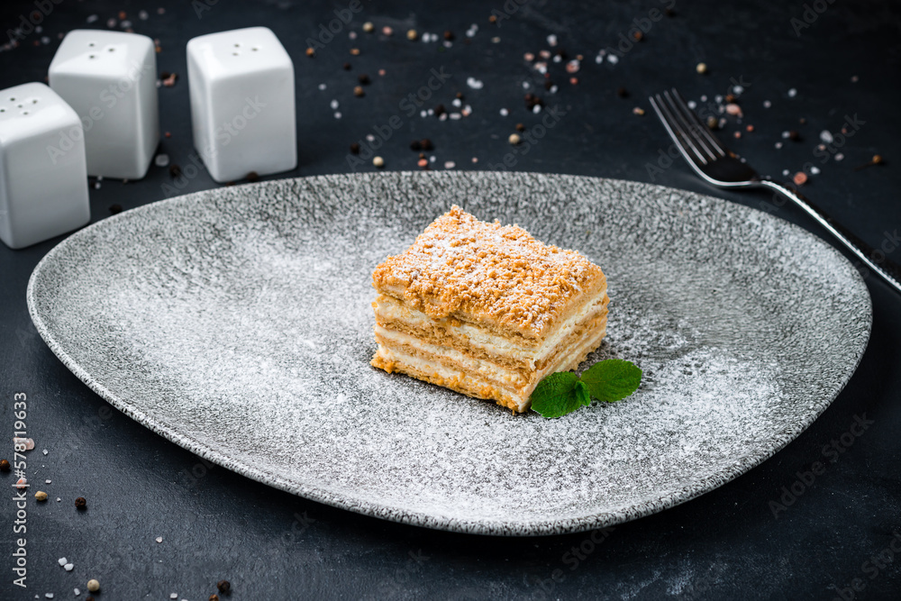 Slice of classic layer cake Napoleon with mint on plate.