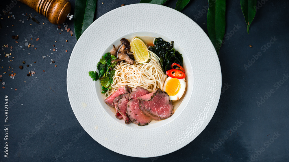 Ramen soup with slices beef, mushrooms, egg, lime, seaweed and greens.