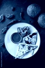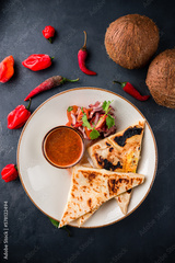 Flatbread stuffed with sauce and fresh vegetable salad, greens.