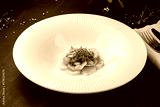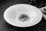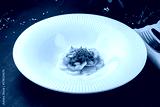 Fresh salad with squid pieces, kiwi, sauce and microgreens.