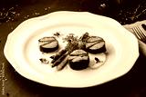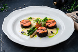 Rolls of salmon, asparagus, red caviar, microgreens and sauce.