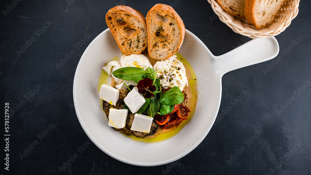 Breakfast poached egg, tomatoes, eggplant, feta cheese, spinach, hummus and toasted bread slices.