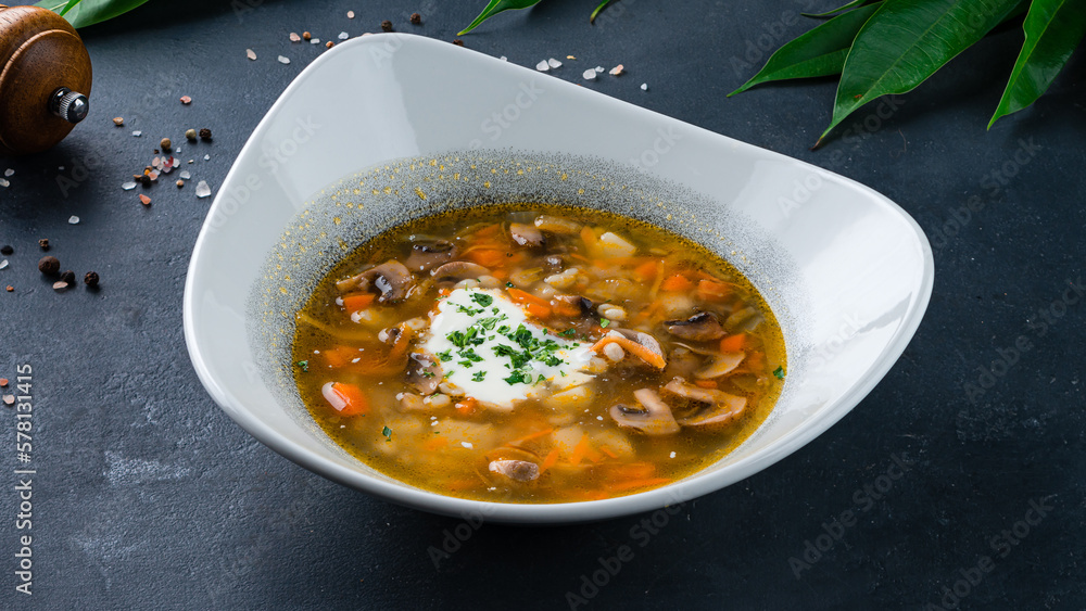 Champignon soup with with potatoes, carrots, onions, sour cream and greens.
