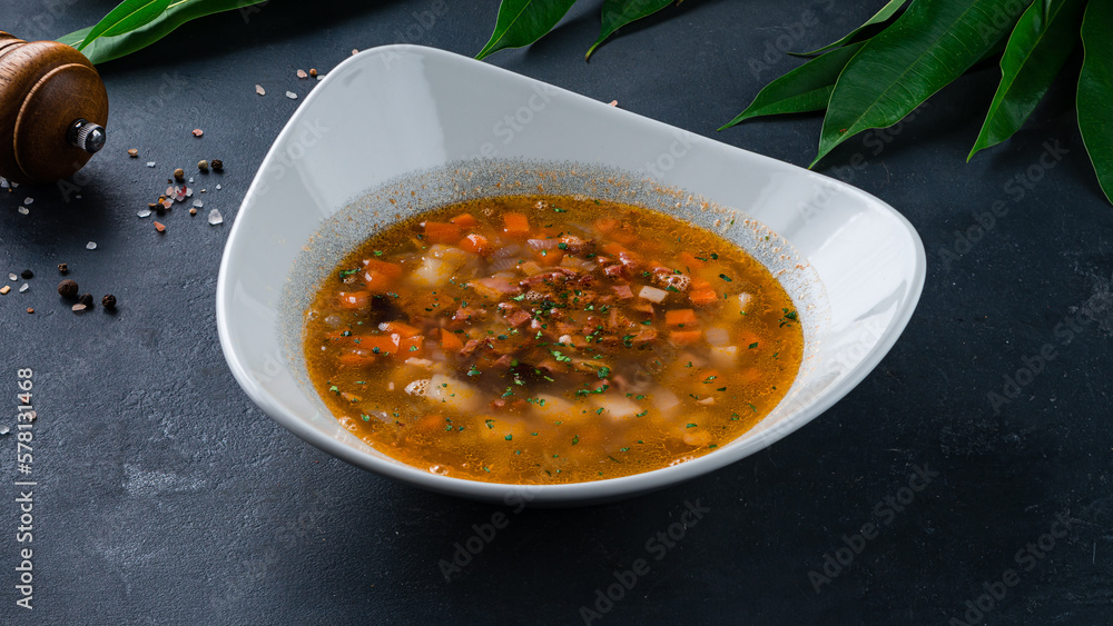 Pickle soup with pickled cucumbers, potatoes, carrots and meat.