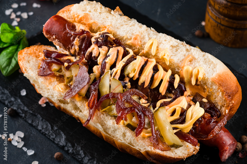 Fresh hot dog with sausage, fried onions, pickled cucumbers and mayonnaise.