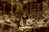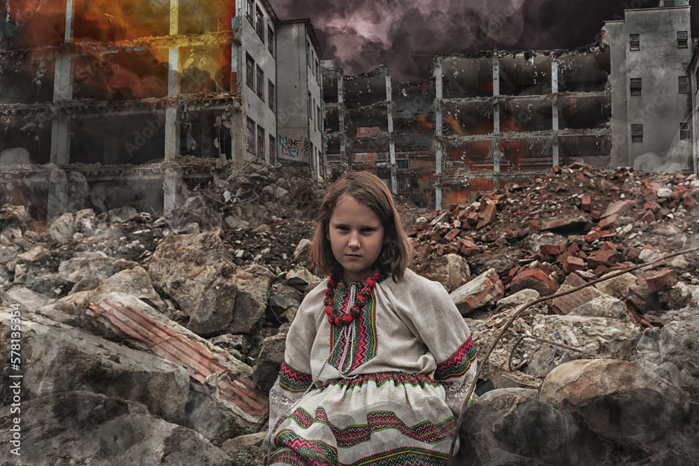 little girl in Ukrainian folk costume sitting among ruins of house. Refugees concept. War crisis in Ukraine. Humanitarian disaster concept.