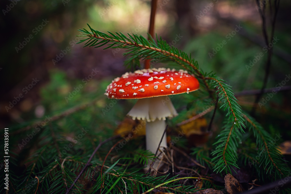 Fly agaric or fly amanita mushroom (Amanita muscaria). Muscimol mushroom. Wild mushroom growing in forest. Ukraine.