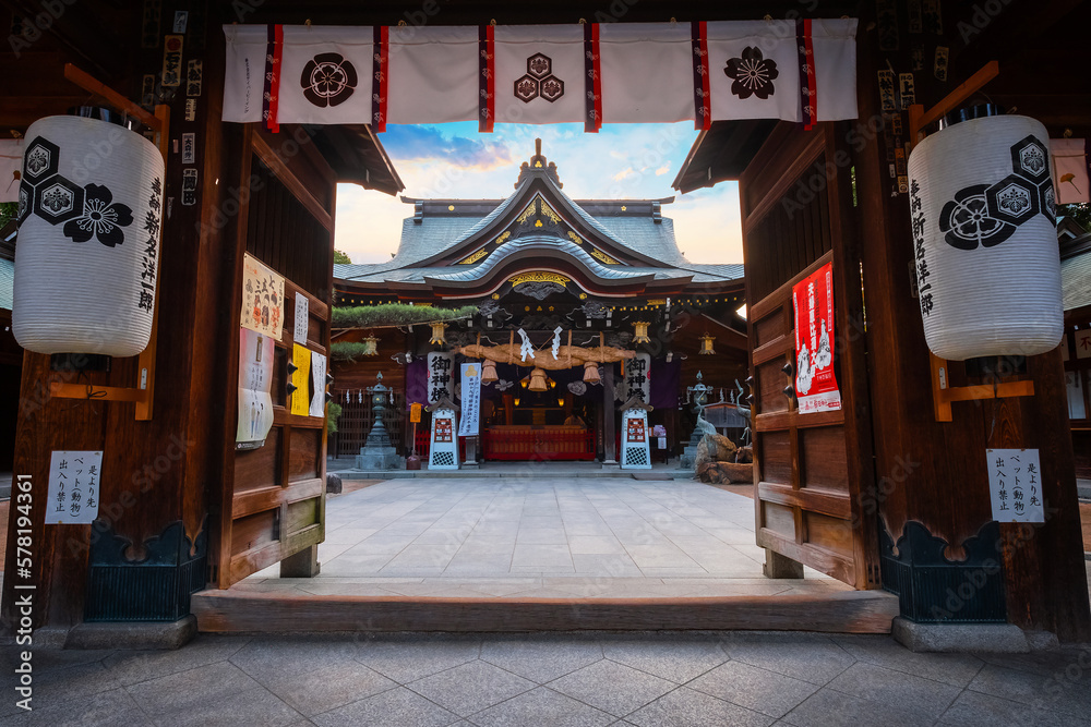 Fukuoka, Japan - Nov 20 2022: Kushida shrine in Hakata ward, founded in 757, the shrine dedicated to Amaterasu the goddess of the sun and Susanoo god of seas and storms, thunder and lightning