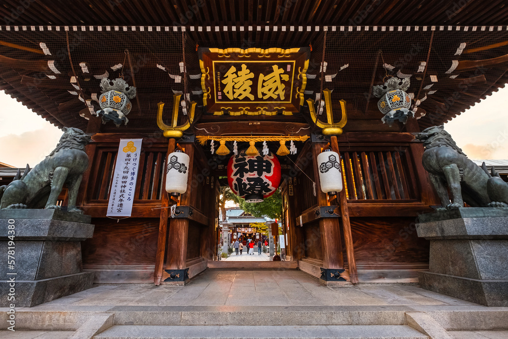 Fukuoka, Japan - Nov 20 2022: Kushida shrine in Hakata ward, founded in 757, the shrine dedicated to Amaterasu the goddess of the sun and Susanoo god of seas and storms, thunder and lightning