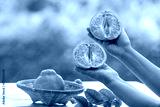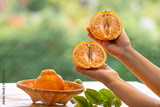 Hand Holding Fresh Sweet Orange fruit over blur greenery background, Dekopon orange or sumo mandarin tangerine over green natural Blur background.