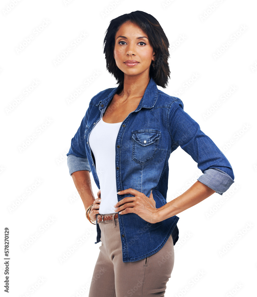 A confident and motivated African black woman embodying a strong vision of success and determination stands with her hands on her hips isolated on a png background.