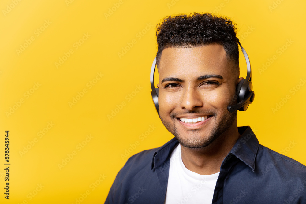 Smiling young Indian office worker in glasses and headset looking at the camera and smiles, positive man working in the customer service department, isolated on yellow