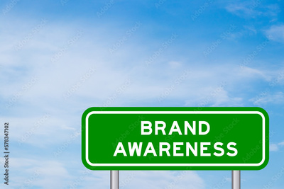 Green color transportation sign with word brand awareness on blue sky with white cloud background