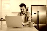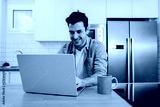 Handsome caucasian man working with a laptop computer at home kitchen drinking coffee and enjoying the morning. Happy young entrepreneur or student searching information on internet. Freelance work