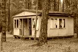 Abandoned wooden mobile homes in a forgotten, abandoned holiday resort on an autumn day. Mess.