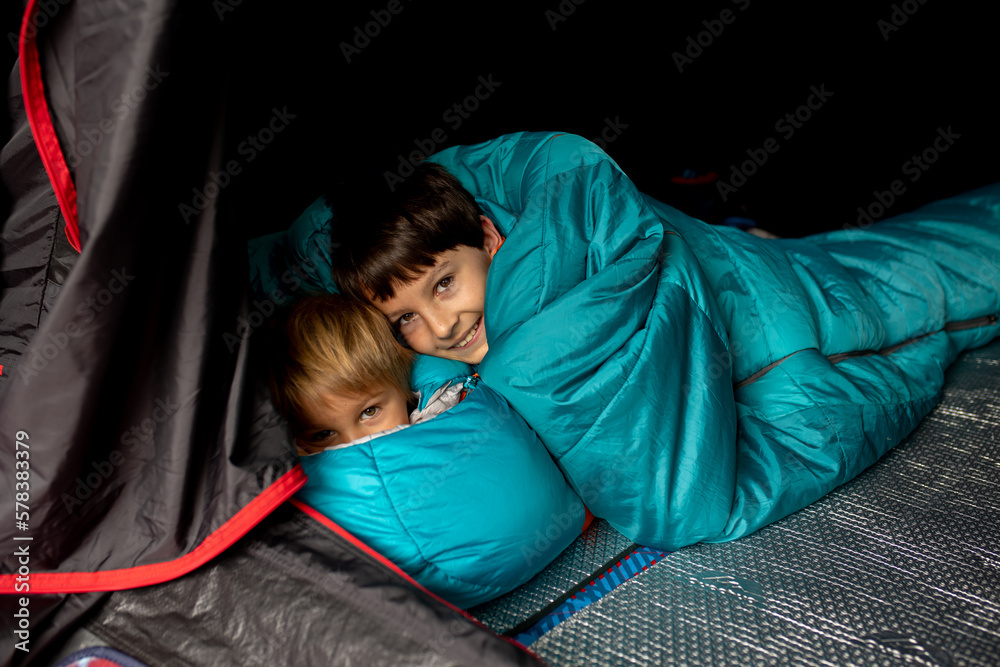 Children, sibilngs, sleeping in sleeping bags in a tent in Norway