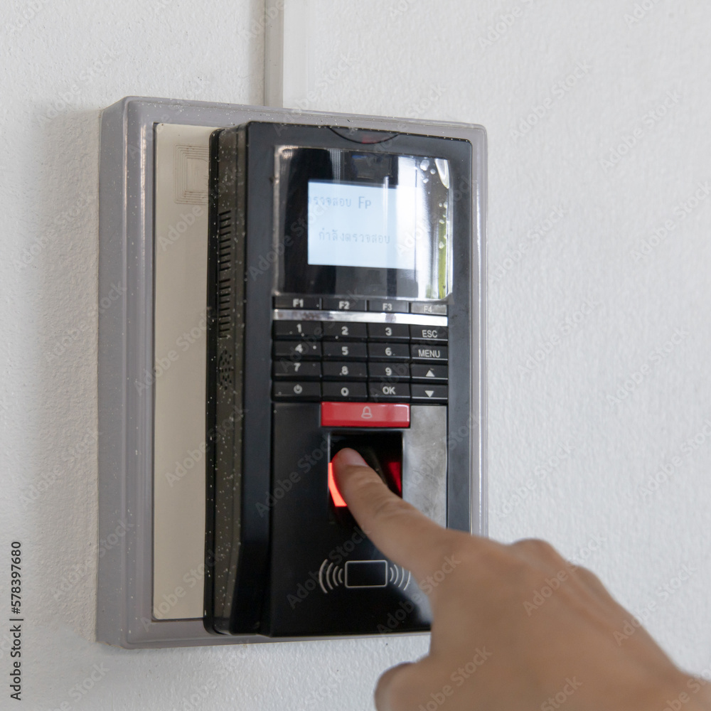 Finger print scan, Male employees press sensors to record company attendance time and after work, Time Recorder Attendance - Out work, Encryption for identity verification or electronic signing