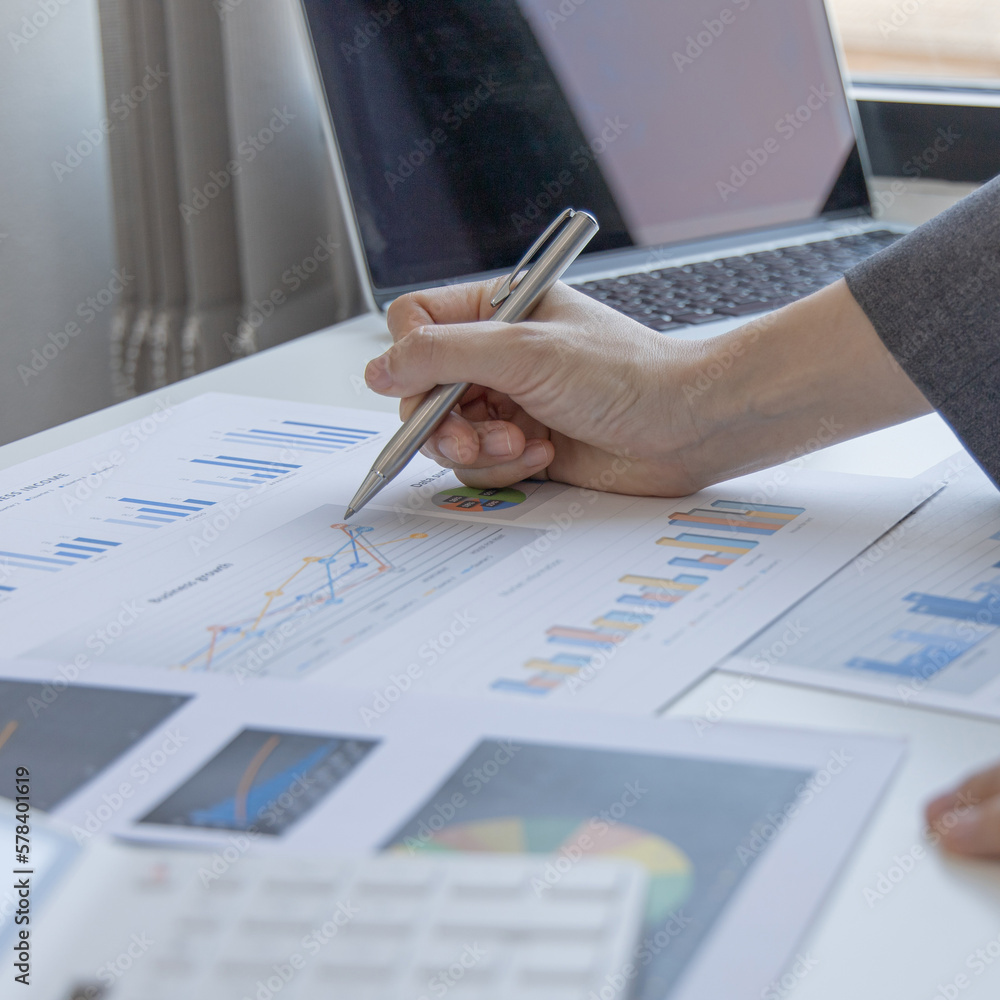 Financial businesswomen analyze the graph of the company's performance to create profits and growth, Market research reports and income statistics, Financial and Accounting concept.