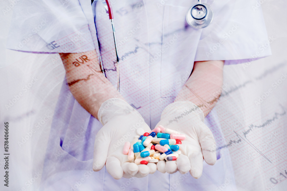 Doctor woman holding pill or medication in capsule. concept of pharmacist, drugs, diet pill, antibiotic or vitamin