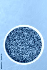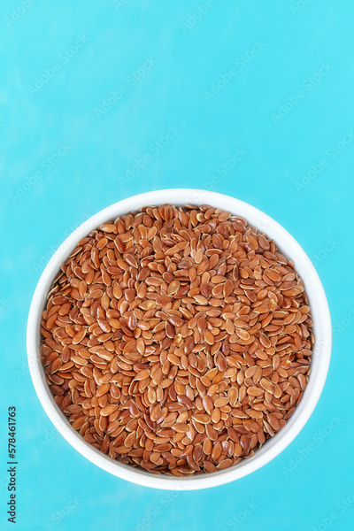 Close up picture of organic flax seeds in a bowl, selective focus.
