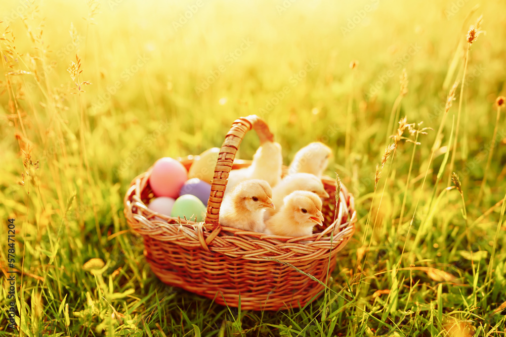 a basket full of small chickens on the grass. Easter Holiday postcard