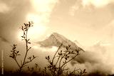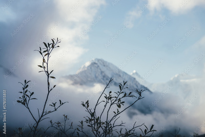 Wonderful view through silhouettes of branches with autumn leaves to snowy mountain above thick clouds in sunshine. Scenic mountain landscape with white-snow pinnacle among dense low clouds in blur.