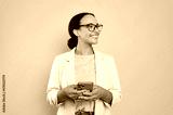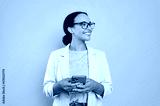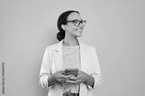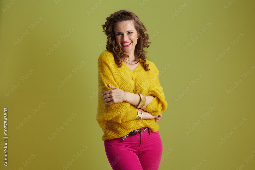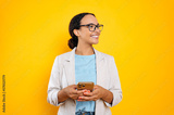 Lovely confident mixed race woman with glasses, stylishly dressed, using mobile phone, chatting in social media, texting message, looks to the side, smiling, stand on isolated yellow background