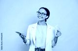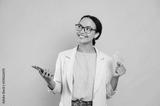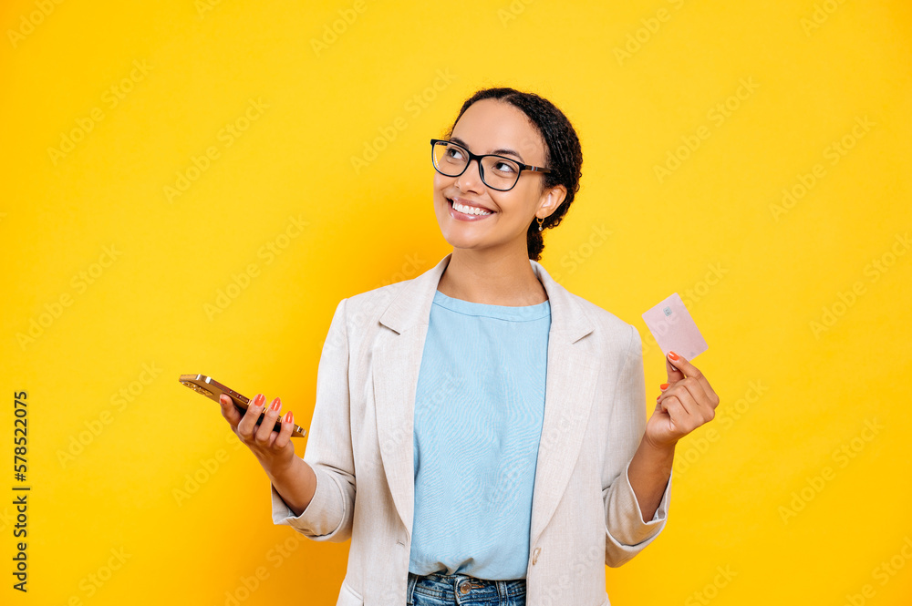 Positive confident pretty mixed race woman, stylishly dressed, banker, banking consultant, holds cellphone and credit card in hands, looks away, thinking, dreaming, smile, isolated yellow background
