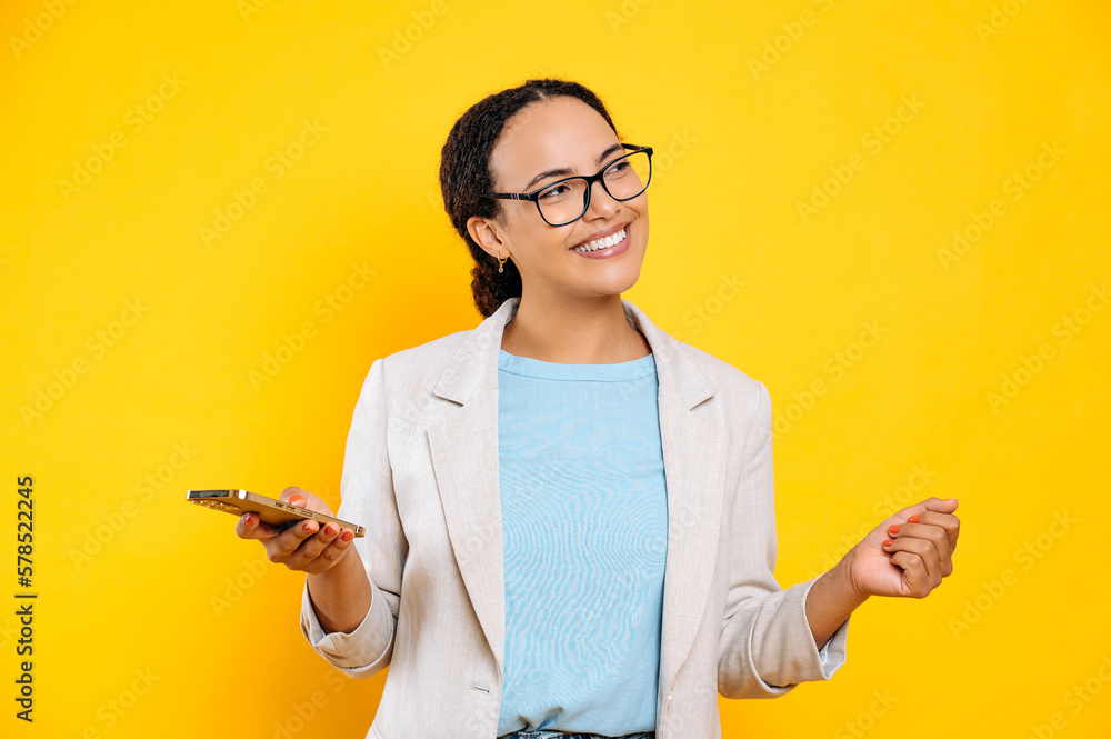 Successful confident pretty brazilian or latino woman with glasses, stylishly dressed, holds mobile phone in hand, looks to the side, smiling, thinking, dreaming, stand on isolated yellow background