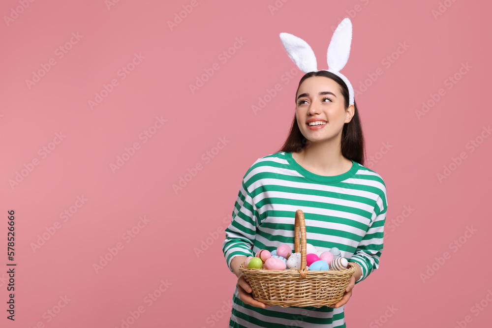 Happy woman in bunny ears headband holding wicker basket of painted Easter eggs on pink background. Space for text