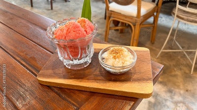 Top view Watermelon mashed top corner, eaten with sticky rice, sprinkled with minced fish