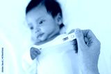 mother measuring temperature of her ill baby. sick child with high fever on bed