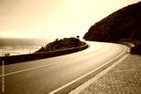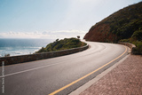 Mountain, road and ocean view with no people for travel, destination or sightseeing in Cape Town. Nature, beauty on empty street for road trip, vacation or holiday on South Africa blue sky background