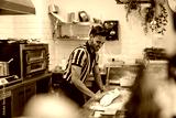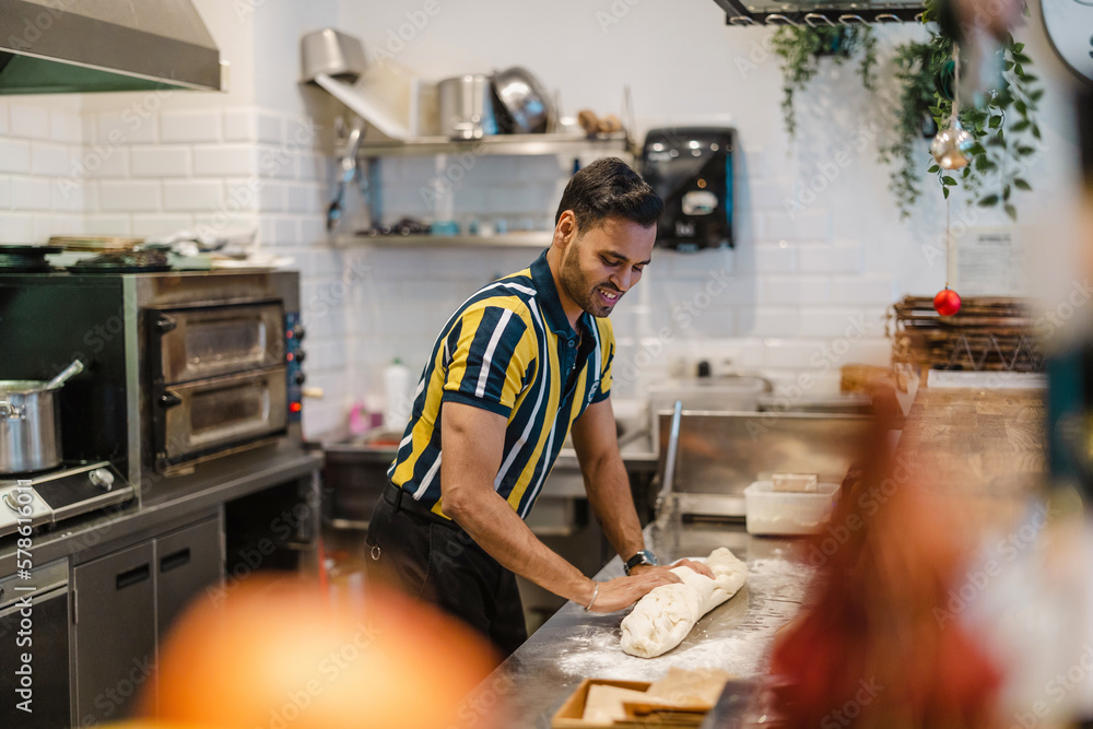 Young man preparing fresh food in commercial kitchen